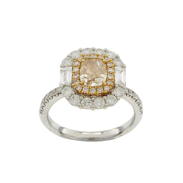 peso 5 gr.taglio a cuscino ct 1,01 circa purezza SI, diamanti taglio brillante ct 0,85 circa colore F/G - purezza VS/SI e due diamanti taglio baguette colore G/H - purezza IF/VVS, misura 11, completo di certificato gemmologico
