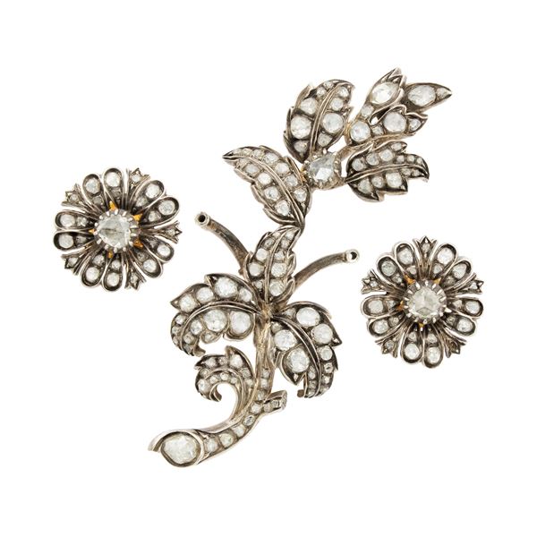 peso 46 gr.in oro giallo e argento, i due fiori centrali si svitano e possono essere indossati come orecchini, dimensioni 8,3x4,3 cm.