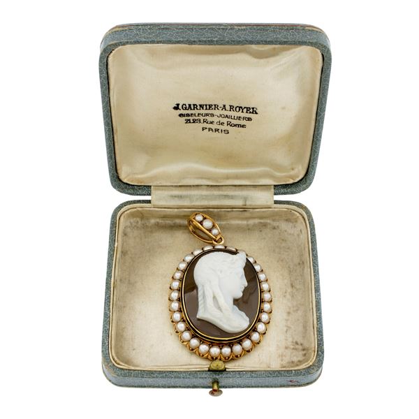 peso 34 gr.raffigurante profilo neoclassico su agata, entro cornice in oro e perline, dimensioni 4,9x3,9 cm. entro scatola originale