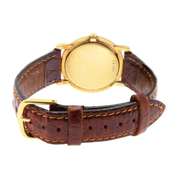 in oro giallo 18kt, cassa tonda 31mm. ref. 52282, quadrante bianco con numeri romani, movimento meccanico a carica manuale, calibro Vacheron Constantin 2003, cinturino con fibbia in metallo dorato, cassa quadrante e movimento firmati