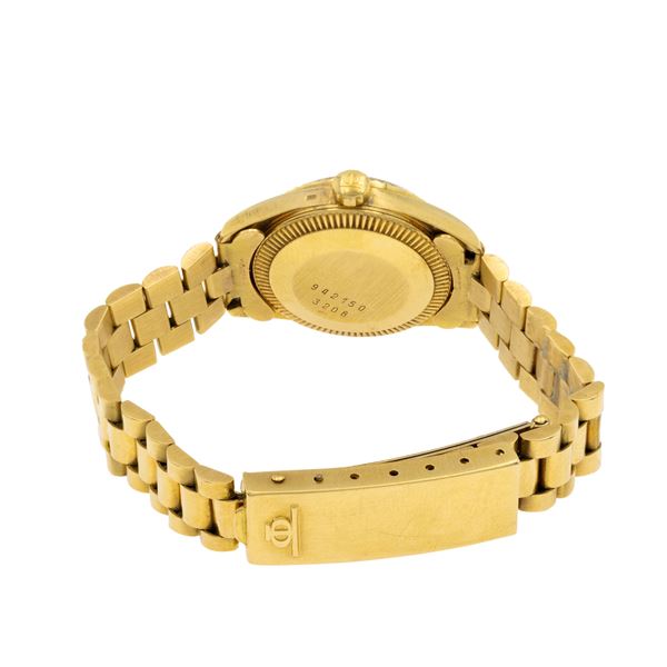 peso 61 gr.in oro giallo 18kt, ref. 942150 - 3208, cassa tonda 25 mm. quadrante champagne con numeri romani, datario ore 3, vetro plastica, movimento meccanico a carica automatica, calibro 760, bracciale jubileé in oro giallo 18kt, cassa quadrante e movimento firmati