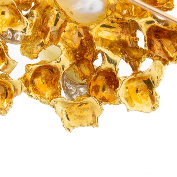 peso 52 gr.in oro giallo 14kt centrata da perla barocca, diamanti taglio brillante ct 3,60 circa, dimensioni 6x6,2 cm.
