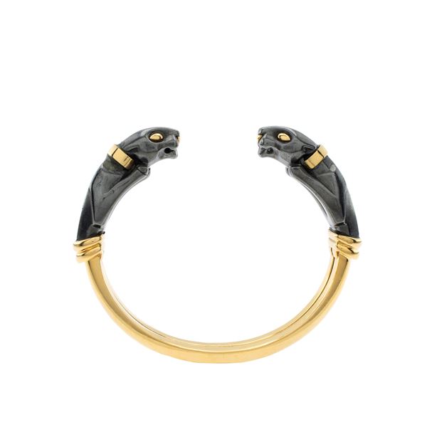 peso 52 gr.in oro giallo 18kt a manetta flessibile, terminali con teste di pantere in argento brunito, una lievi difetti, diametro 6 cm.