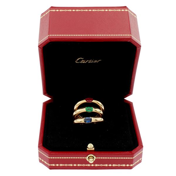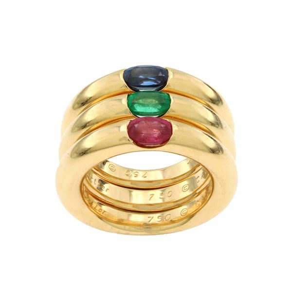 peso 27 gr.in oro giallo 18kt centrati da uno zaffiro, uno smeraldo e un rubino taglio ovale misto, misura 12, completi di scatola