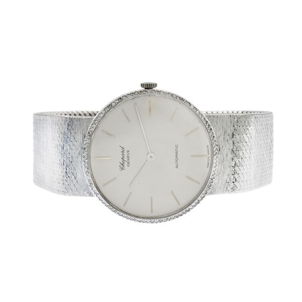 peso 76 gr.in oro bianco 18kt, ref. 105968 - 1038, cassa tonda 33 mm. quadrante argentato con indici, ghiera con diamanti taglio huit-huit, vetro zaffiro, movimento meccanico a carica automatica, calibro chopard 2-66, bracciale in oro bianco 18kt, cassa, quadrante e movimento firmati