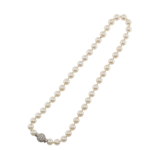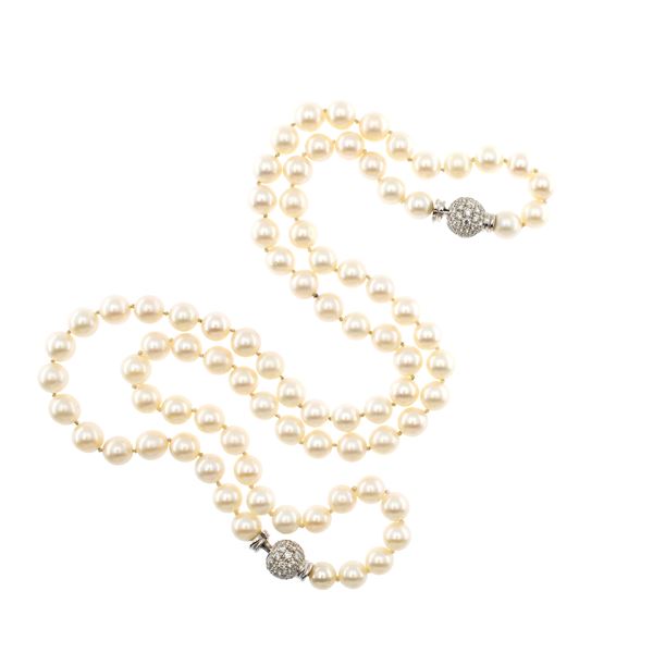peso 76 gr.di 8 mm. circa, due chiusure a sfera in oro bianco 18kt e diamanti taglio brillante ct 2 circa, la collana è divisibile in due a formare due girocolli separati da 40 cm. ciascuno, lunghezza totale 80 cm.