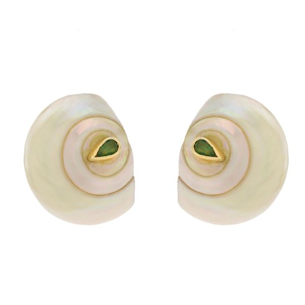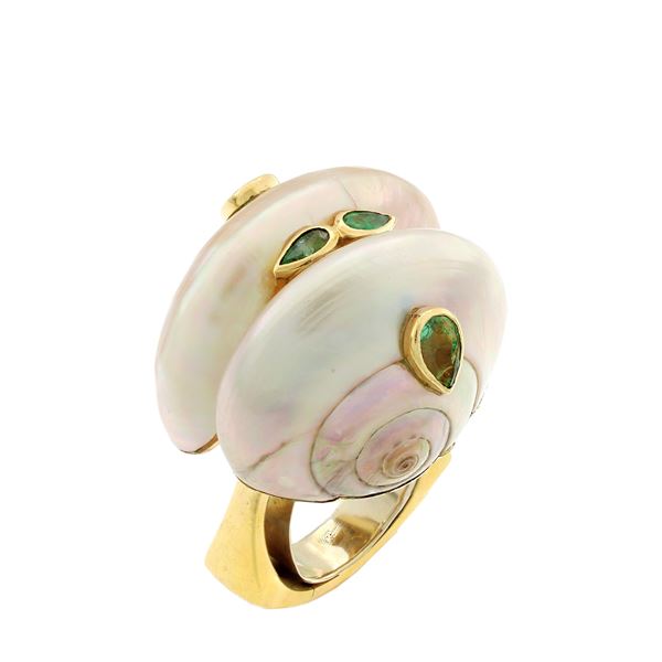 peso 49 gr.in oro giallo 18kt sezioni in madreperla, lievi difetti, e smeraldi taglio a goccia, firmati, anni 70, anello misura 19 con molla interna, orecchini a lobo dimensioni 2,8x1,9, cm.