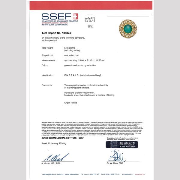 peso 51,8 gr.taglio ovale cabochon misure 23.00 x 21,40 x 11,50 mm. completo di certificato gemmologico, dimensioni totali pendente 6x4,5 cm.