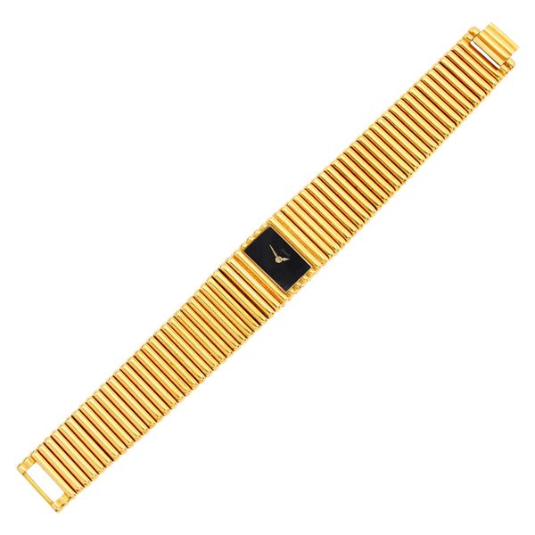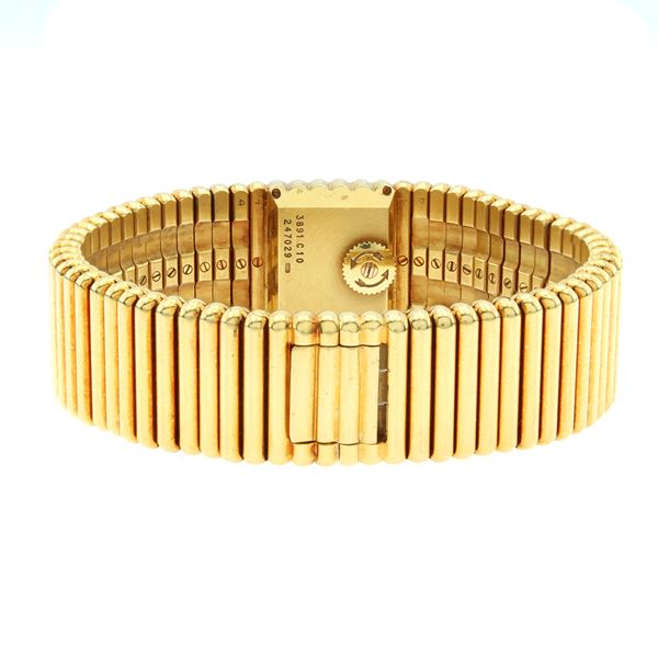 peso 154 gr.in oro giallo 18kt, ref. 3891 C 10 - 247029, cassa carré 20x16 mm. quadrante nero senza indici, vetro zaffiro, corona di carica sotto la cassa, movimento meccanico a carica automatica, calibro 6N, bracciale originale in oro giallo con chiusura a scomparsa, lunghezza 18 cm. cassa, quadrante e movimento firmati