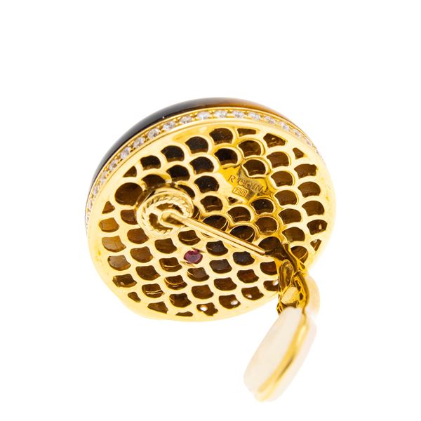 peso 28 gr.in oro giallo 18kt occhio di tigre e diamanti taglio brillante, diametro 2,4 cm.
