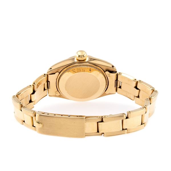 peso 56 gr.in oro giallo 18kt, ref. 6917 - 3408057, cassa tonda 26 mm. quadrante argentato con indici, datario ore 3, movimento meccanico a carica automatica, calibro 2030, bracciale oyster in oro giallo 18kt, cassa, quadrante e movimento firmati, completo di scatola e garanzia