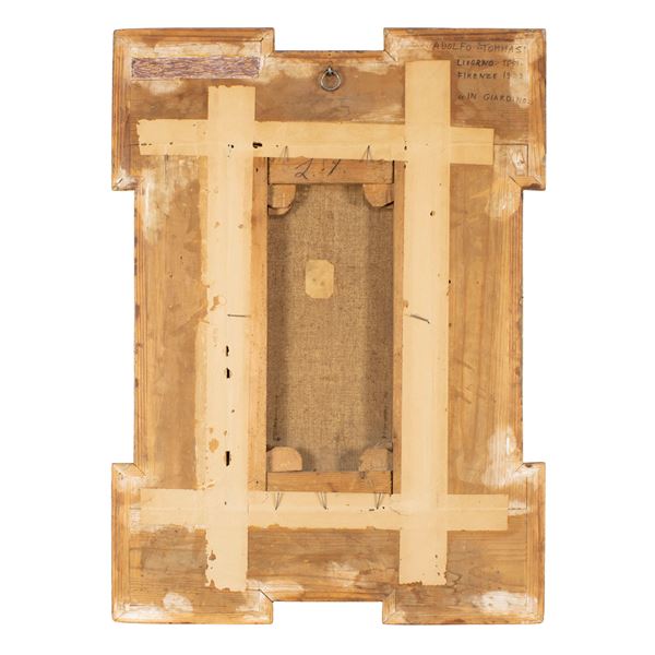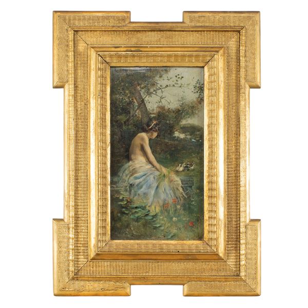 40x23,5 cm."Figura femminile con sfondo di passaggio", olio su tela, firmato in basso a sinistra, entro cornice