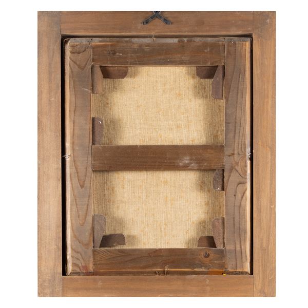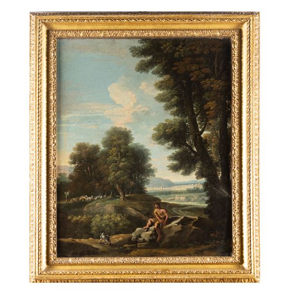48x38 cm."Paesaggio con figura seduta, cane e gregge sullo sfondo", olio su tela, entro cornice