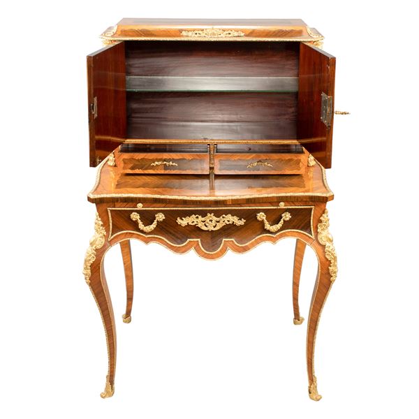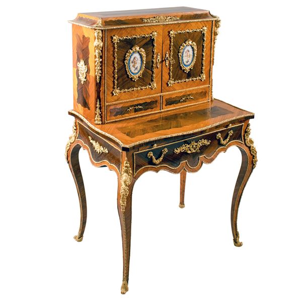 decorato con ricche applicazioni in bronzo dorato, base mistilinea con un cassetto, tablette scrittoio a scomparsa, alzata a due ante centrate da due placche ovali in porcellana policroma, vano interno a giorno con due tiretti sottostanti, gambe di linea mossa, usure