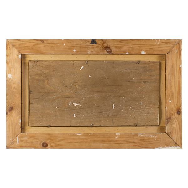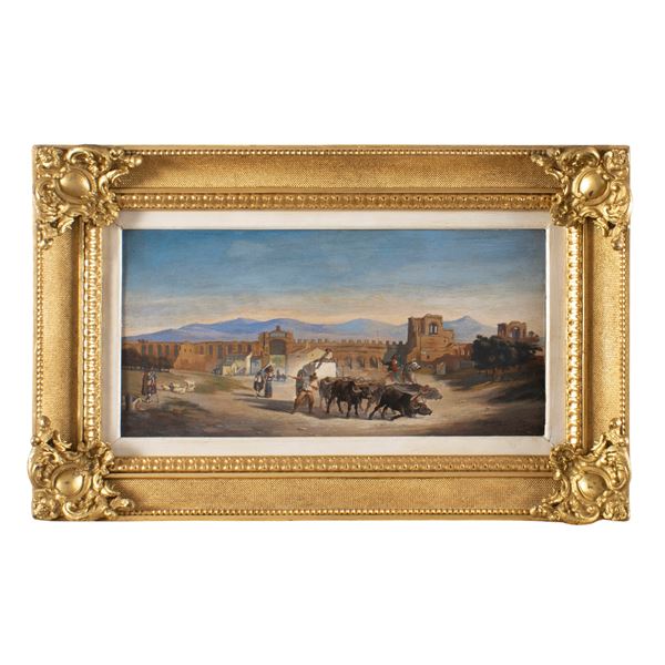 23,5x47 cm."Paesaggio con rovine e carro di buoi", 1870, olio su tavola, firmato e datato in basso a destra, entro cornice