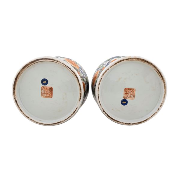 50x30 cm.decorati in policromia con rami di pruno in fiore, crisantemi e altre foglie stilizzate, coperchi con presa a foggia di cane di Pho, marchio apocrifo
