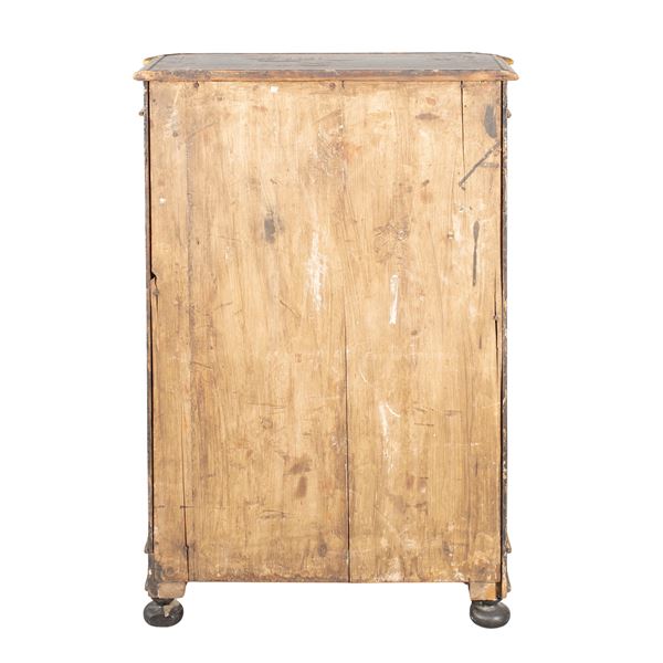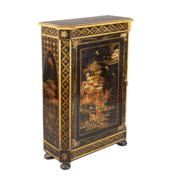 101,5x70x32 cm.interamente decorata con motivi a chinoiserie, piano sagomato con un'anta sottostante, piedi a cipolla, lievi difetti