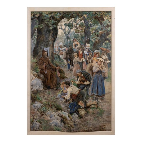 71x48 cm."Il pellegrinaggio", 1931, acquerello su carta, firmato e datato in basso a destra, entro cornice
