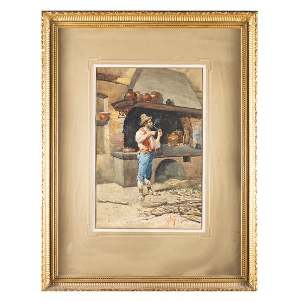 48x31 cm."Scena di genere con figura maschile in costume tradizionale", acquerello su carta, firmato in basso a destra, entro cornice