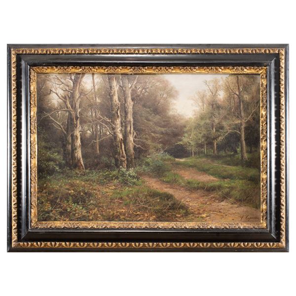 51x77 cm."Bosco", olio su tela, firmato in basso a destra, entro cornice