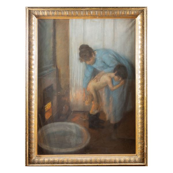 92x66 cm."L'ora del bagno", pastello su carta, firmato in basso a destra, entro cornice