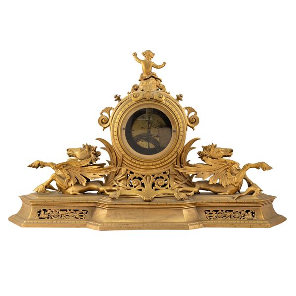 52x70x25 cm.quadrante circolare con numeri arabi in smalto sormontato da un putto, base sagomata decorata ai lati da due animali mitologici e ricchi motivi floreali e vegetali, al centro un putto alato con le braccia aperte a reggere due corone
