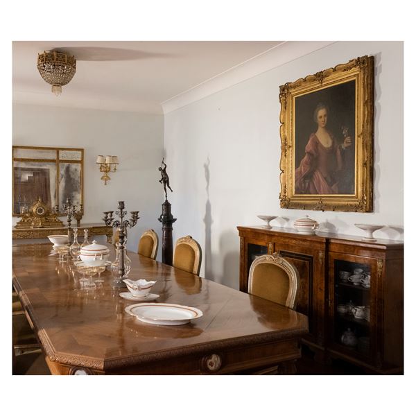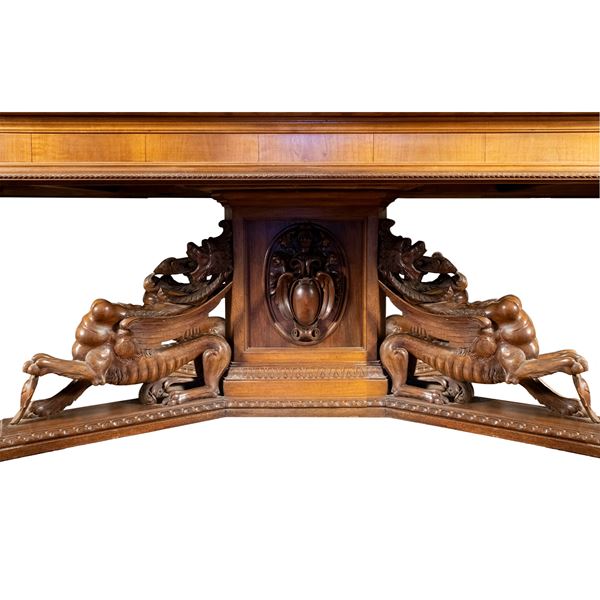 piano sagomato e fascia sottostante decorata da dieci placche circolari in porcellana policroma, poggiante su un imponente sostegno centrale scolpito su entrambi i lati, riccamente decorato con uno scudo centrale a motivi floreali, affiancato da figure di animali mitologici, gambe a balaustro completano la struttura, usure