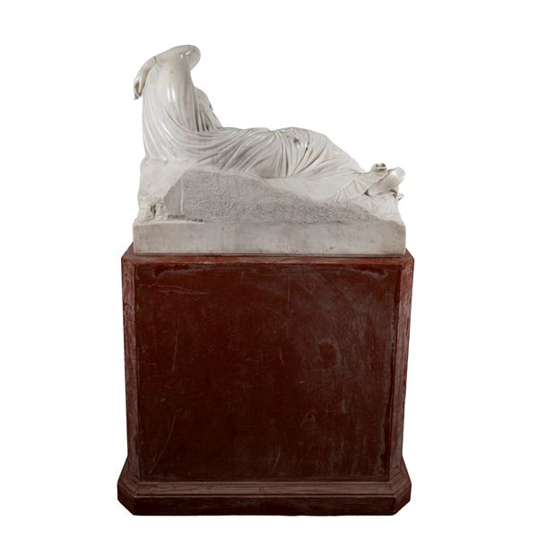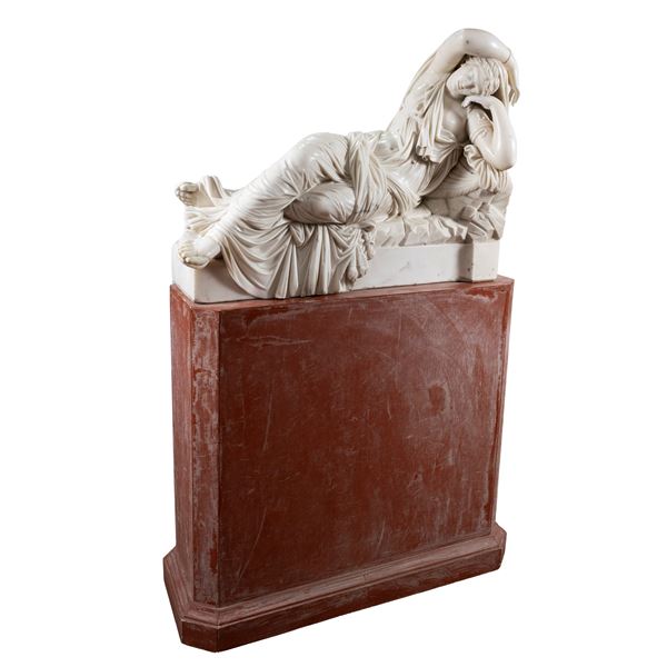 scultura 58,5x87x28 cm. - base 77x80x35 cm.raffigurante Arianna dormiente, poggiante su basamento in legno laccato non pertinente, usure, graffi, alcune sbeccature e mancanze, restauri.