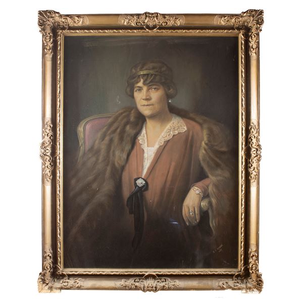 103x78 cm."Ritratto femminile con pelliccia", 1927, pastello, firmato e datato in basso a destra, entro cornice