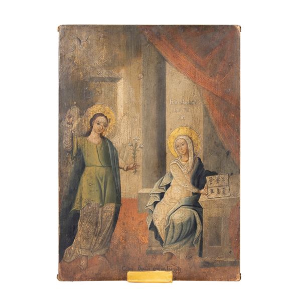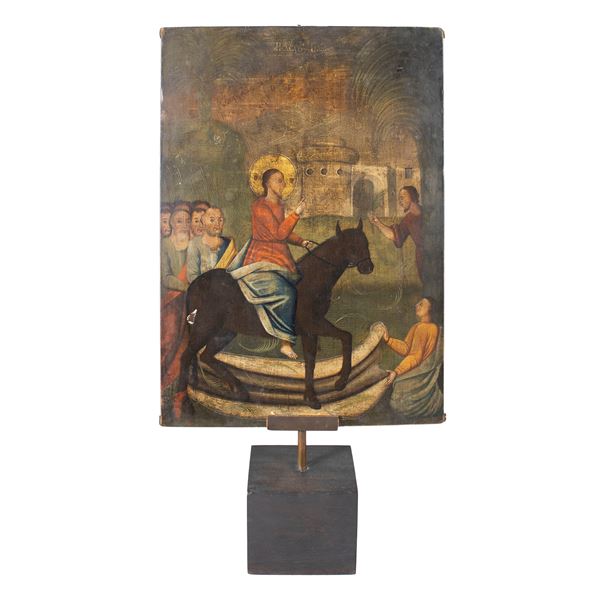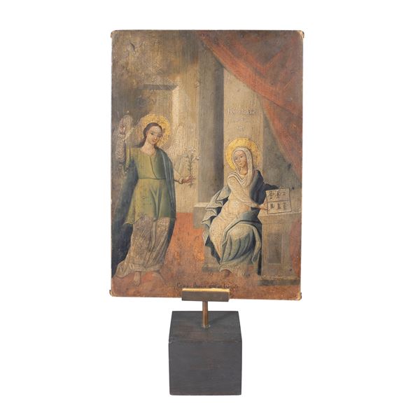 37x26 cm.raffigurante L'Annunciazione e l'Ingresso di Gesù a Gerusalemme, poggiante su piedistallo in legno