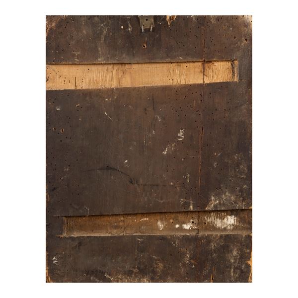 39x31 cm.raffigurante la Crocifissione, la Vergine Odigitria, San Nicola di Bari, San Michele Arcangelo e San Giorgio, difetti