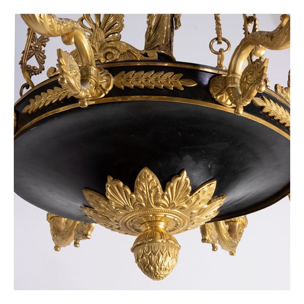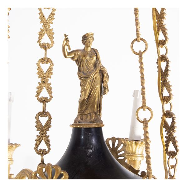 100x74 cm.corpo centrale decorato da una fascia continua con ghirlanda di foglie d'alloro con al centro una figura classica femminile scolpita a tutto tondo, sorretto da catene cesellate, bracci portacandele a voluta con boboches fogliate
