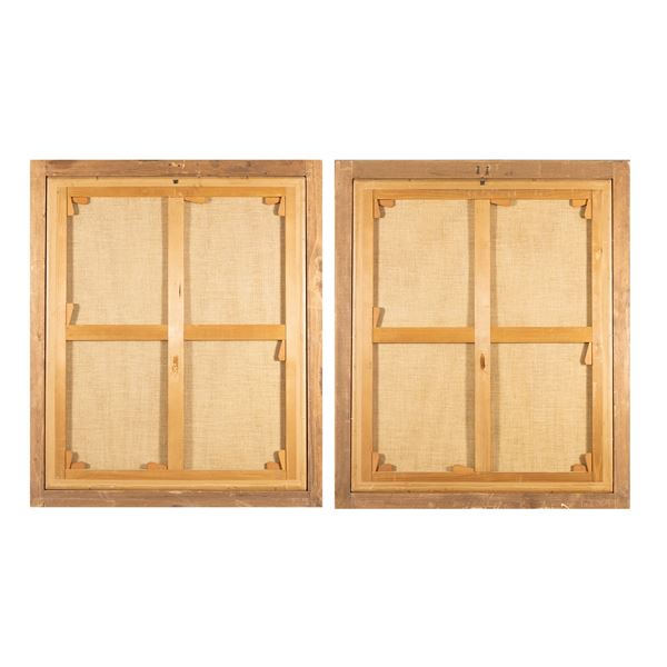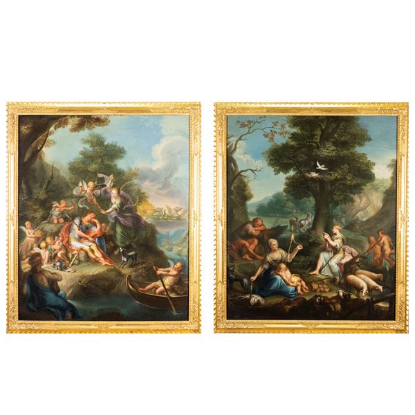 120x100 cm."Erminia incide sull'albero il nome di Tancredi - Rinaldo dorme nell'isola incantata di Armida", coppia di oli su tela, entro cornici