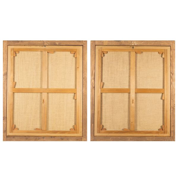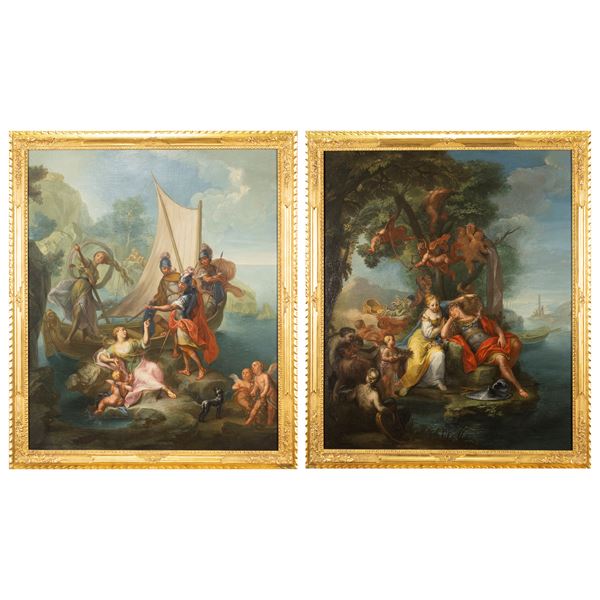 120x100 cm."Rinaldo incantato da Armida - Rinaldo lascia l'isola di Armida per andare al Campo Cristiano", coppia di oli su tela, entro cornici