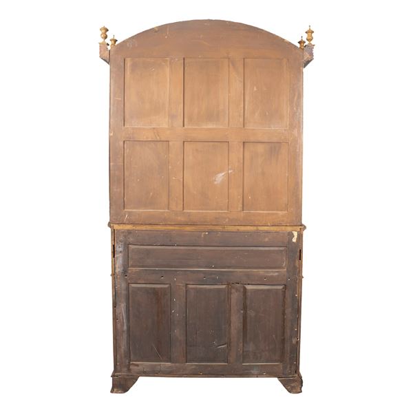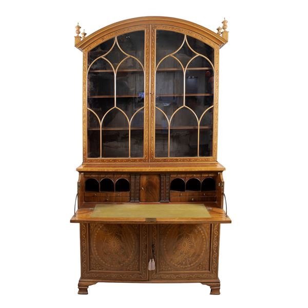 243x126x49 cm.intarsiato in legni di frutto e decorato con ghirlande floreali e motivi vegetali, parte superiore a due ante a vetro, un cassetto scrittoio sottostante estraibile, completo di tiretti e scomparti vari, parte inferiore a due ante, piedi a mensola, usure e difetti