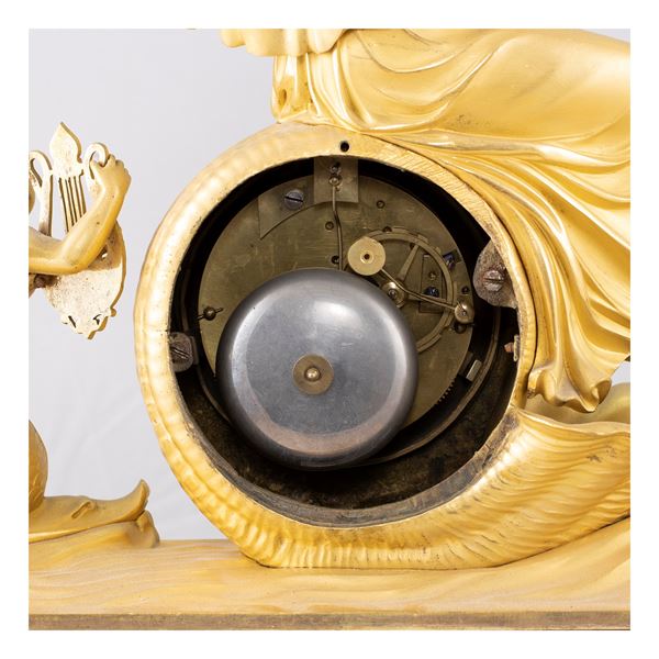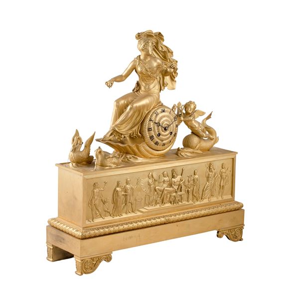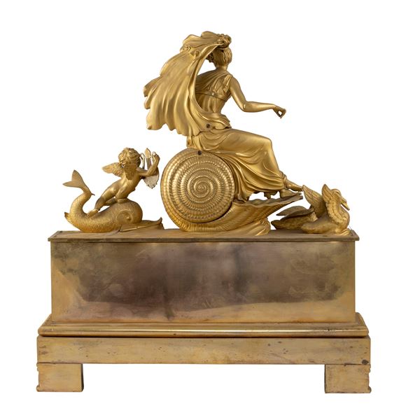 55x51x16 cm.struttura architettonica sormontata da una figura allegorica femminile, probabilmente Teti, seduta su un guscio di conchiglia, ai lati un putto alato con lira su un delfino e una coppia di cigni, base decorata con scena mitologica in rilievo, quadrante circolare con numeri romani, usure e pendolo mancante