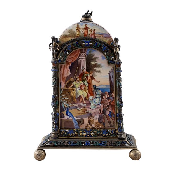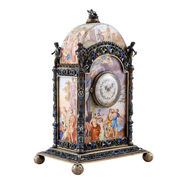 19,5x12x9 cm.struttura architettonica decorata con placche sagomate in smalto incassate nelle struttura raffiguranti scene mitologiche, quadrante circolare firmato Lepine Hger du Roi à Paris, poggianti su quattro piedini a sfera