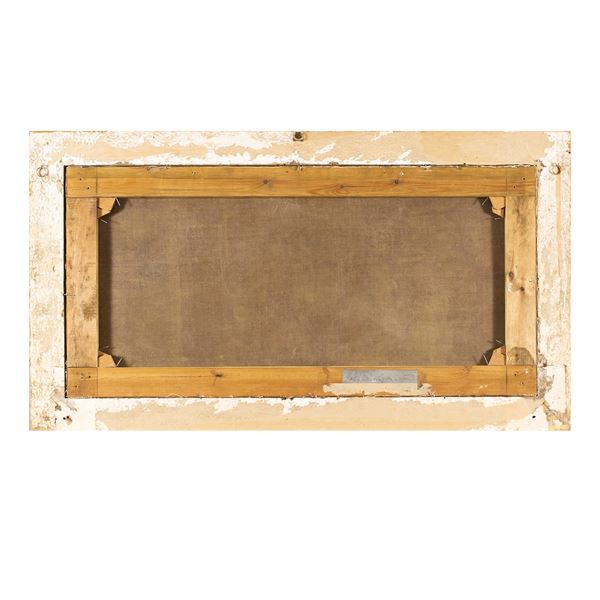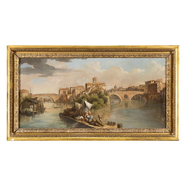 48x98 cm."Veduta dell'Isola Tiberina", olio su tela, entro cornice