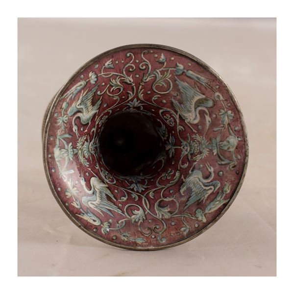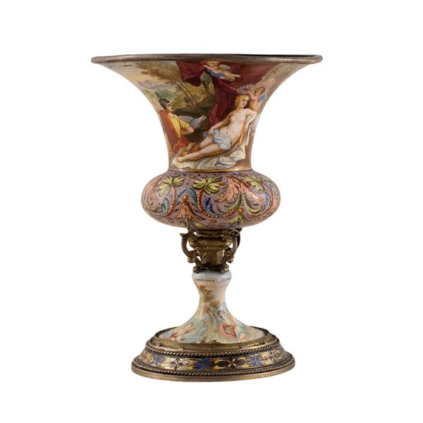 Piccolo vaso in smalto policromo, argento e bronzo dorato