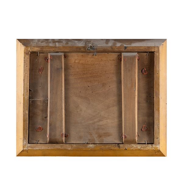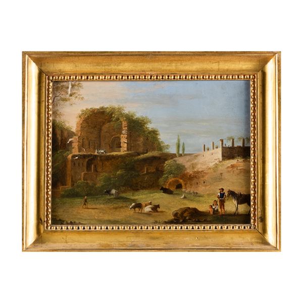 24x33,5 cm."Paesaggio con rovine, figure e animali", olio su tavola, entro cornice