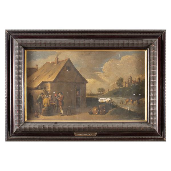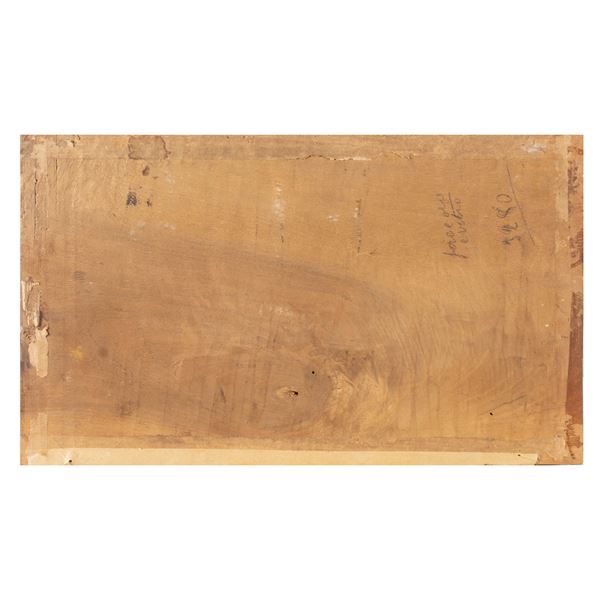 27,5x47 cm."Birreria di campagna", olio su tavola, entro cornice, cadute di colore