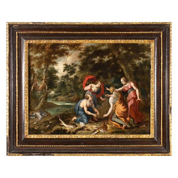 77x101 cm."Le Ninfe di Diana che tornano dalla pesca", olio su rame, entro cornice