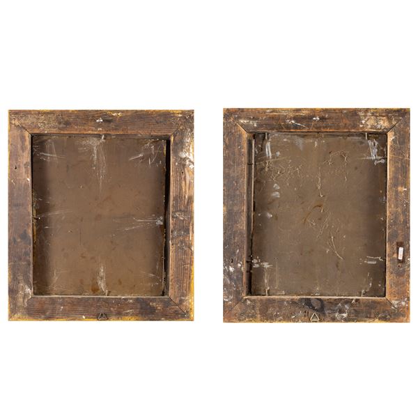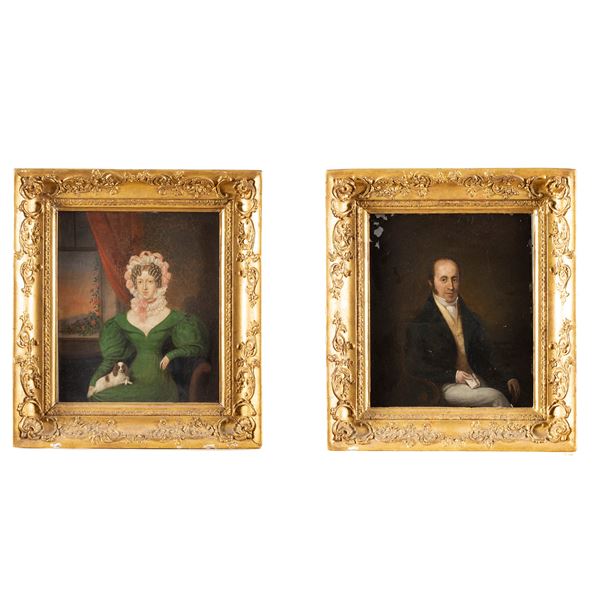 30,5x25,5 cm."Coppia di ritratti di gentildonna e gentiluomo", coppia di oli su lastra di metallo, entro cornici, difetti