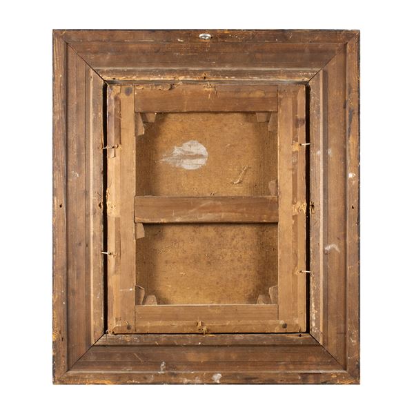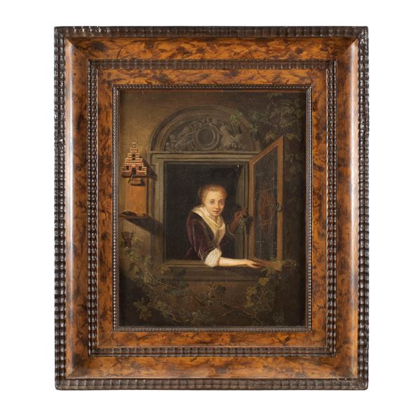 40x32 cm."Giovane donna alla finestra con grappolo d'uva", olio su tela, entro cornice