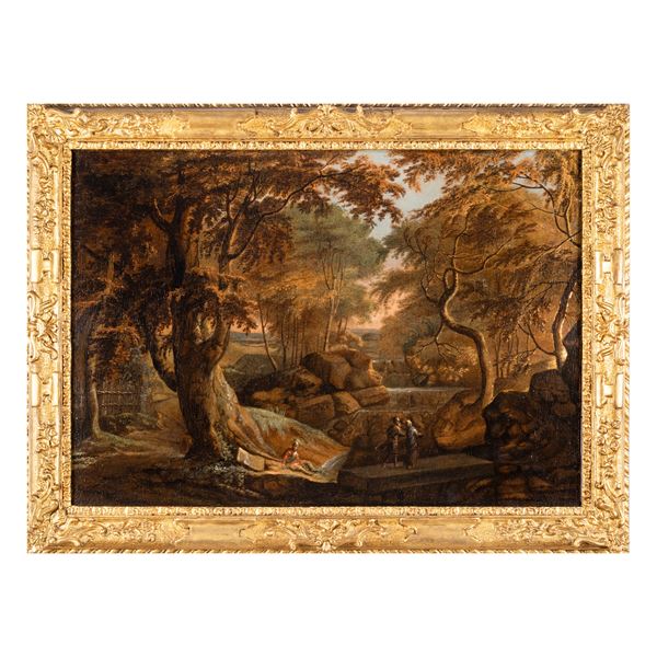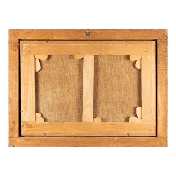 40x57 cm."Paesaggio con figure", olio su tela, entro cornice