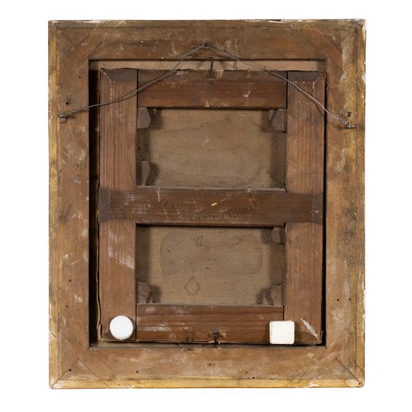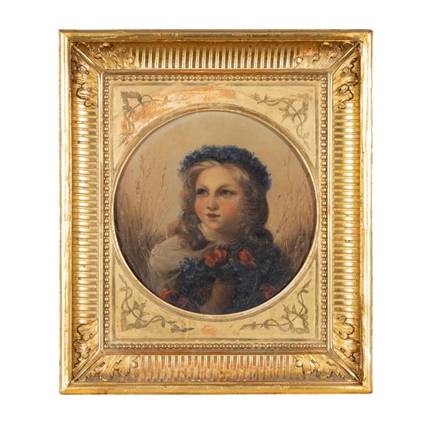 24x20 cm."Ritratto di giovane con ghirlanda floreale", olio su tela, entro cornice