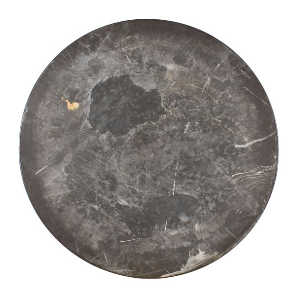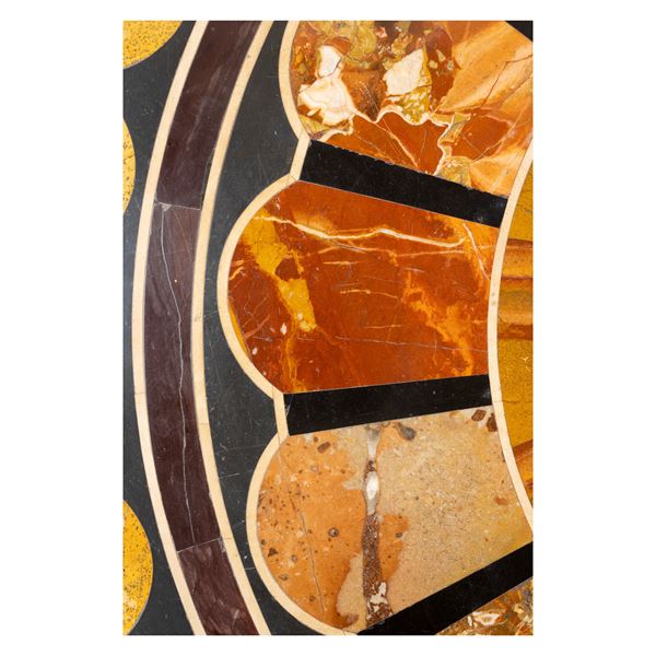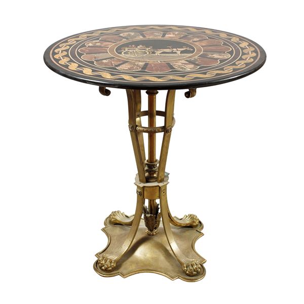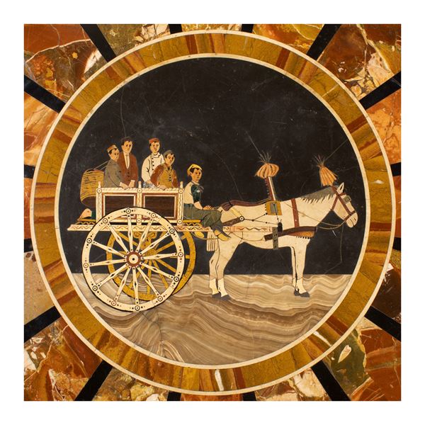 72x67 cm.piano circolare decorato da una scena allegorica con carretto siciliano trainato da cavalli, cornice in marmi e pietre dure circondata da una fascia a motivo geometrico, poggiante su sostegno in bronzo dorato con terminali a piedi ferini su base sagomata, restauri