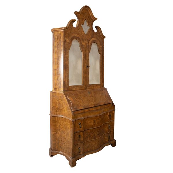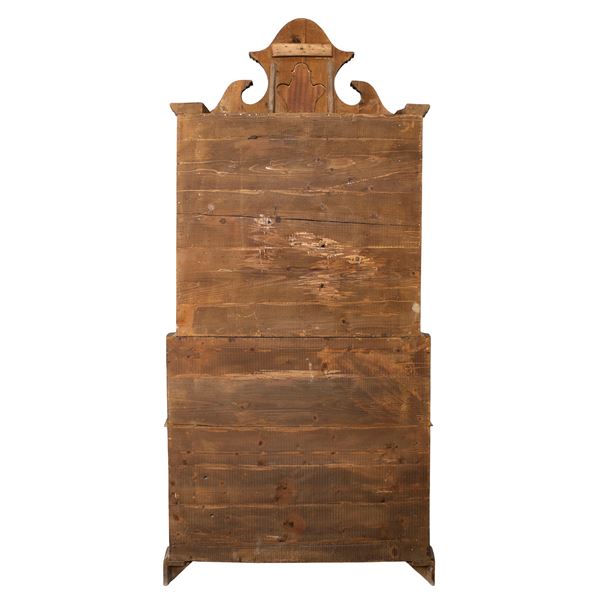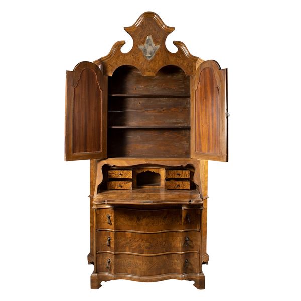 240x120x50 cm.parte superiore a due ante a specchio, parte inferiore di linea mossa con anta a calatoia e tre cassetti sottostanti, usure e difetti