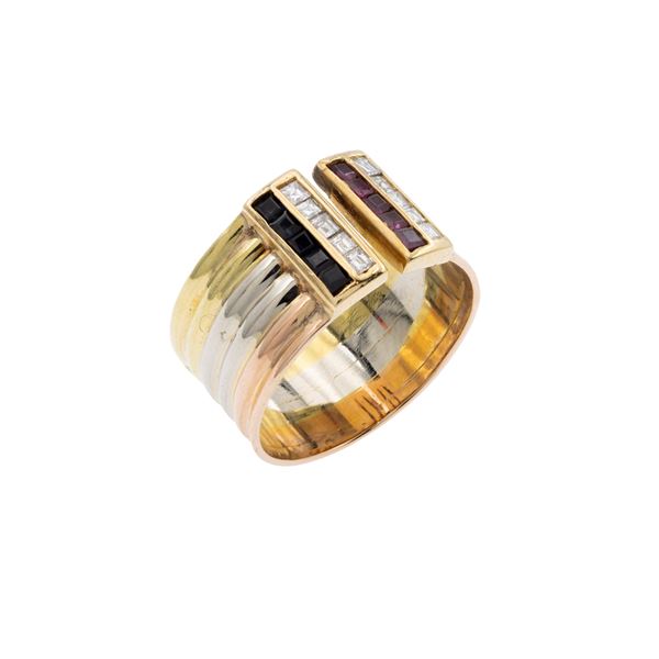 Anello in oro a tre colori 18kt diamanti, rubini e zaffiri