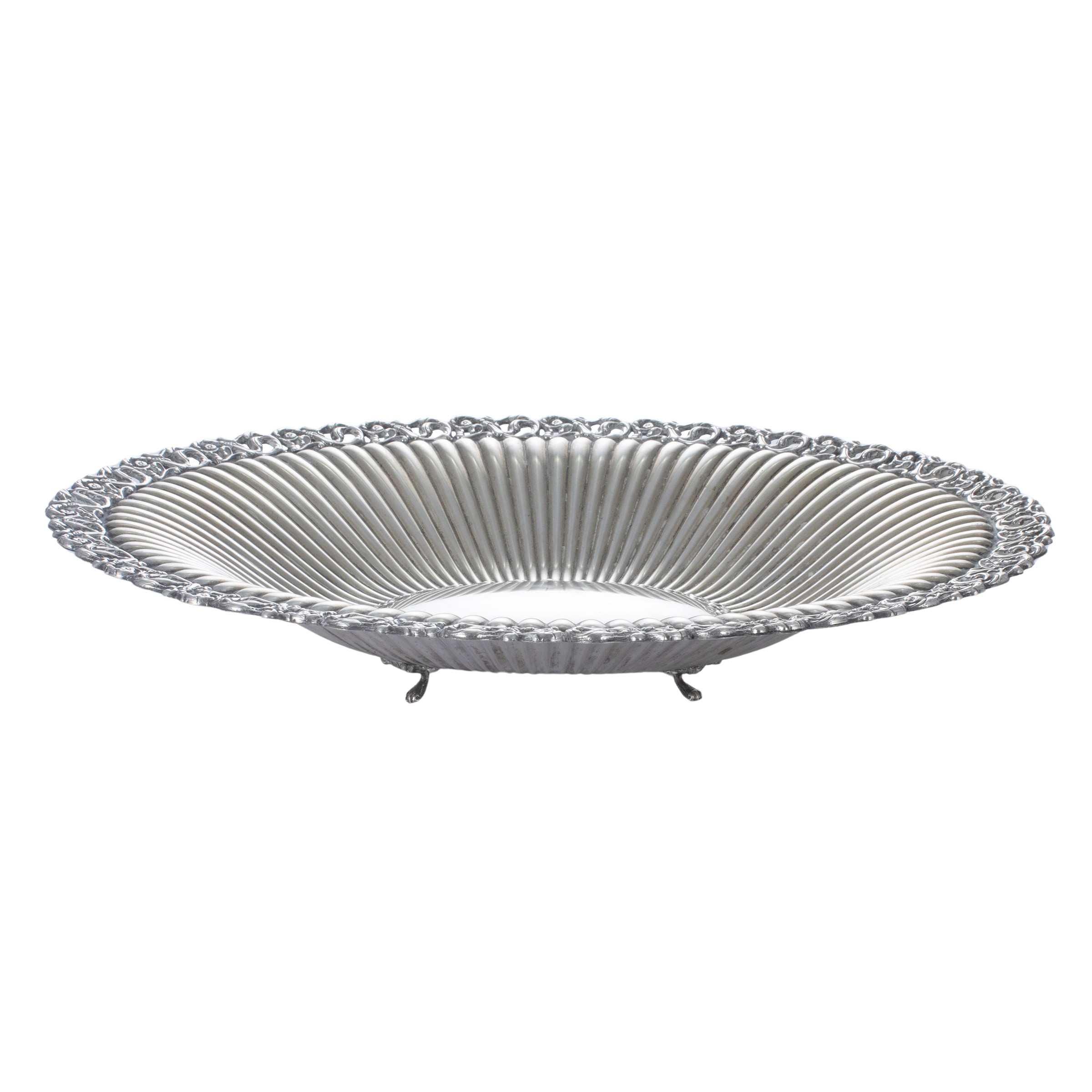 corpo ovale baccellato con profilo traforato, poggiante su quattro piedini, peso 458 gr